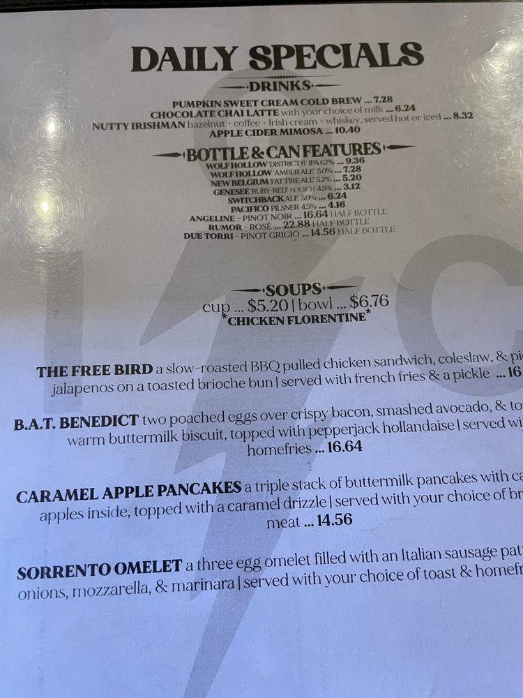 three egg omelet with bacon, salsa fresca, avocado, cheddar, topped with sour cream | served with choice of toast & home fries or dressed greens